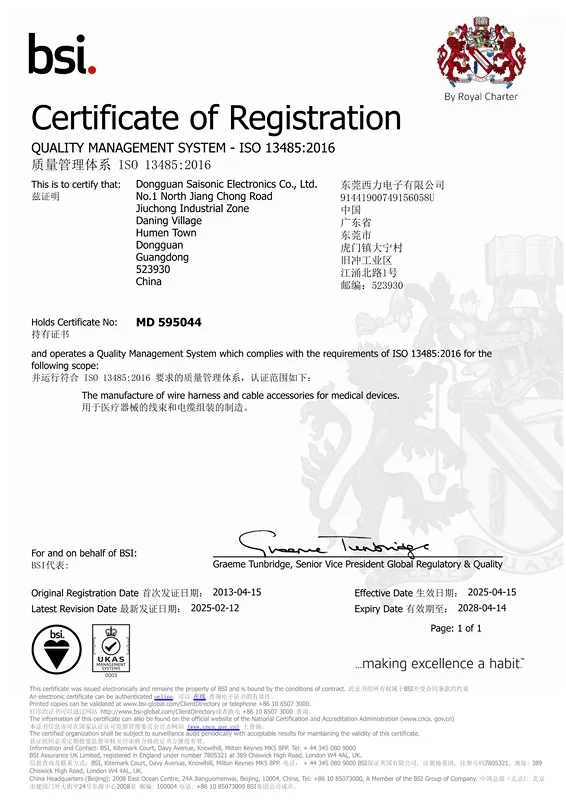 SAISONIC cuenta con las certificaciones ISO9001 e ISO14001 en calidad y gestión ambiental. Todo el proceso de producción es supervisado por nuestro equipo de control de calidad, integrado por especialistas en IQC, OQC, QC y otras áreas, y se inicia con la compra de materias primas y las inspecciones de entrada al almacenamiento, hasta llegar a la producción final. Las materias primas se almacenan bajo condiciones controladas de temperatura y humedad, siguiendo el principio de “primero en entrar, primero en salir” (FIFO). Gracias a nuestro avanzado sistema ERP, realizamos el seguimiento de cada etapa de producción, tanto en arneses (o mazos) como en conjuntos de cables.
